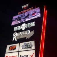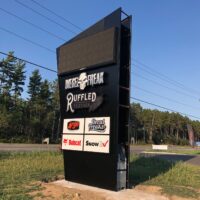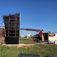 The super-colossal monument sign that Pro Image just recently finished installing here is well-matched to the impressive new complex. We’d produced signage for the Lalones’ businesses before, but this new project was in a whole different realm. To date, it is the largest freestanding sign Pro Image has produced. Headlining the towering 23-foot-tall, 12-foot-wide sign structure is the M-32 Enterprises logo, which we formed in-house on our SDS Channel Bender SXP machine. The centerpiece of the sign is a gigantic 40 square-foot Watchfire 10mm electronic message center. Then below that are the logos for Diesel Freak and Ruffled Feather, also produced with the Channel Bender SXP machine. There is space incorporated at the bottom of the sign for up to four additional tenant panels for future occupants. The overall frame of this sign is primarily constructed of steel and Alupanel (ACM aluminum composite material) and is anchored in place by a whopping 44,000 pounds of concrete! It isn’t going anywhere.