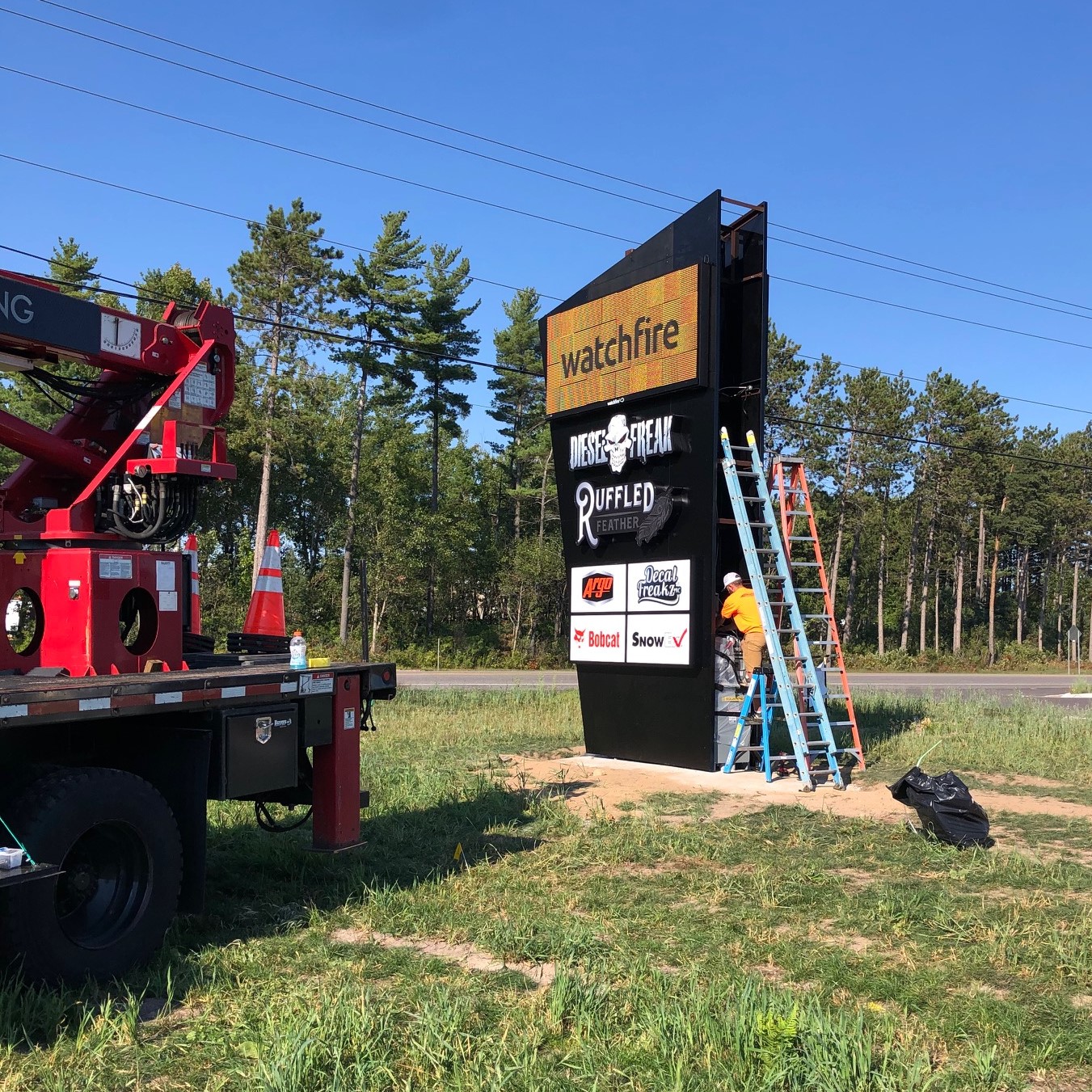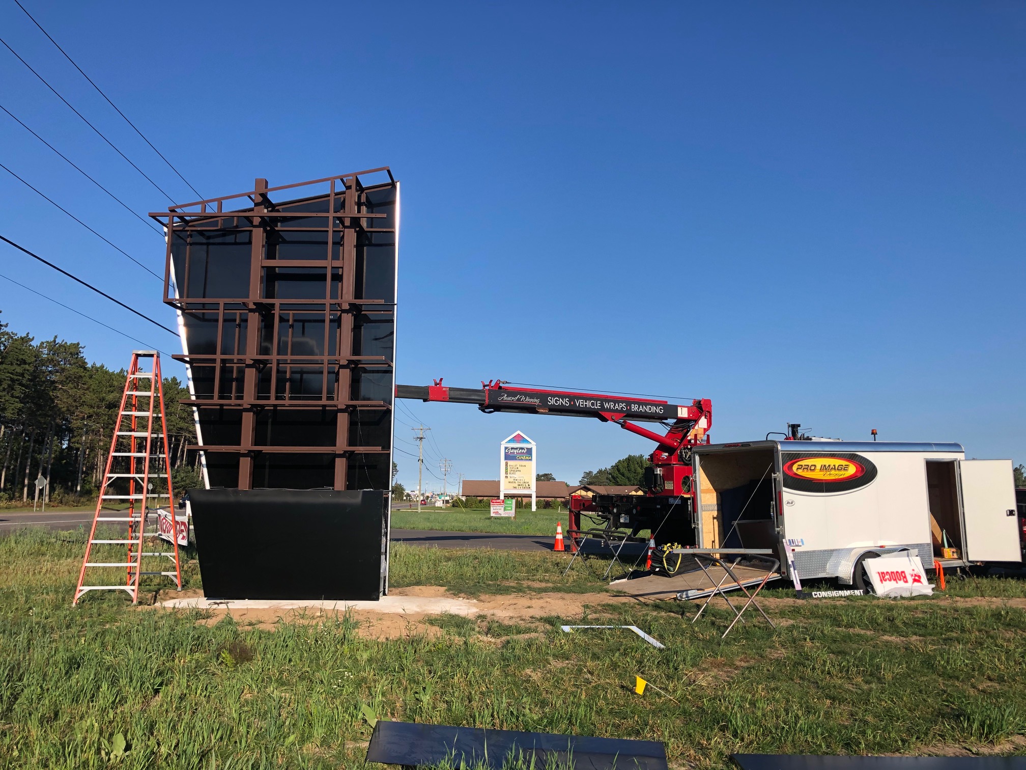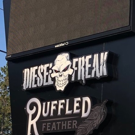 The super-colossal monument sign that Pro Image just recently finished installing here is well-matched to the impressive new complex. We’d produced signage for the Lalones’ businesses before, but this new project was in a whole different realm. To date, it is the largest freestanding sign Pro Image has produced. Headlining the towering 23-foot-tall, 12-foot-wide sign structure is the M-32 Enterprises logo, which we formed in-house on our SDS Channel Bender SXP machine. The centerpiece of the sign is a gigantic 40 square-foot Watchfire 10mm electronic message center. Then below that are the logos for Diesel Freak and Ruffled Feather, also produced with the Channel Bender SXP machine. There is space incorporated at the bottom of the sign for up to four additional tenant panels for future occupants. The overall frame of this sign is primarily constructed of steel and Alupanel (ACM aluminum composite material) and is anchored in place by a whopping 44,000 pounds of concrete! It isn’t going anywhere.